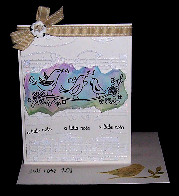Hi! This is the card I did for todays TLC310 challenge. Joan had us double emboss. I used a music score eb folder. I then ran my versamark pad over it and used White Diamond EP. Read about it here. It is also for today`s CAS challenge ~ Rock & Roll. My birdies are Rockin` Robins. :-) Read about it here. Thanks for looking and have a great day!